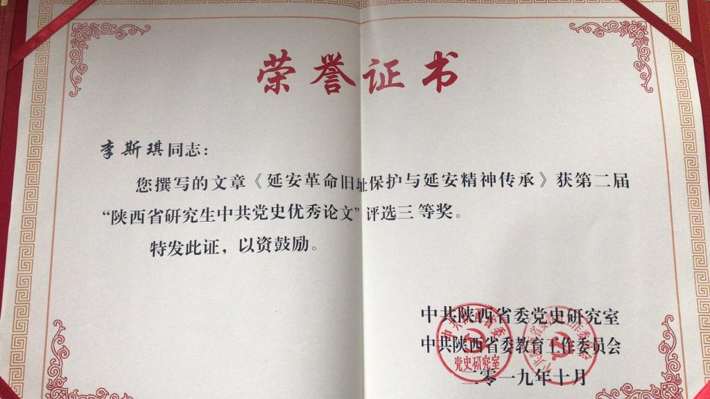 2019年11月5日,在中共陕西省委党史研究室举办的“第二届陕西省研究生中共党史优秀论文颁奖暨学习党史、新中国史研讨会”上,公司17级硕士生李思琪同学提交的论文《延安革命旧址保护于延安精神传承》获得第二届“陕西省研究生中共党史优秀论文”三等奖。