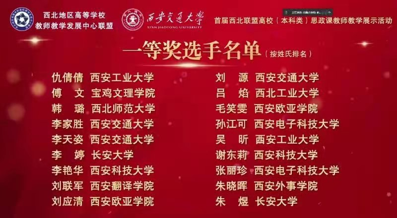 此次高校思政课教师教学展示活动由西北地区高校教师教学发展中心联盟、西安交通大学教师教学发展中心、西安交通大学MK体育、全国高校思政课“手拉手”集体备课中心(西安交通大学)、超星集团等单位主办。来自西北五省(区)43所高校的202名教师,经过5个多月的充分准备和激烈角逐,经网络初评与决赛展示环节,共评出一等奖18项,二等奖33项。