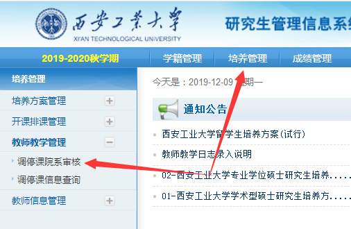 点击页面上方菜单 “培养管理”-点击左侧“调停课院系审核”