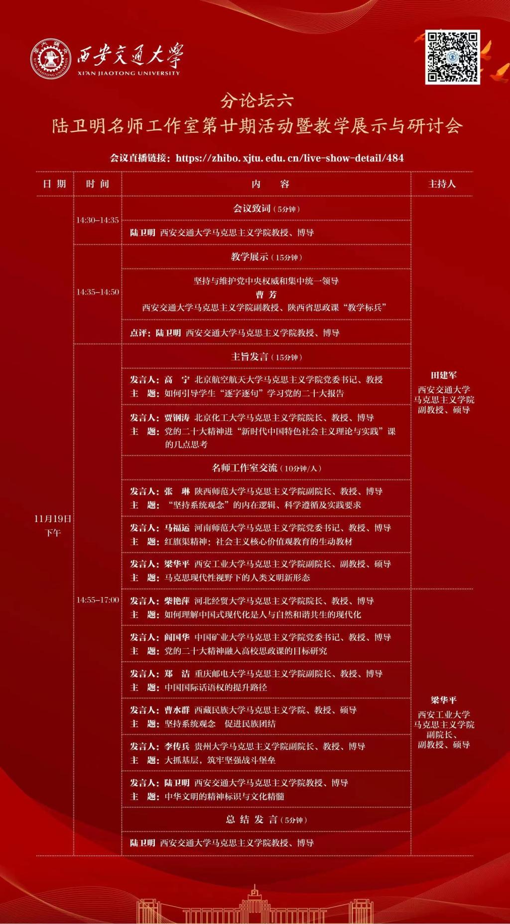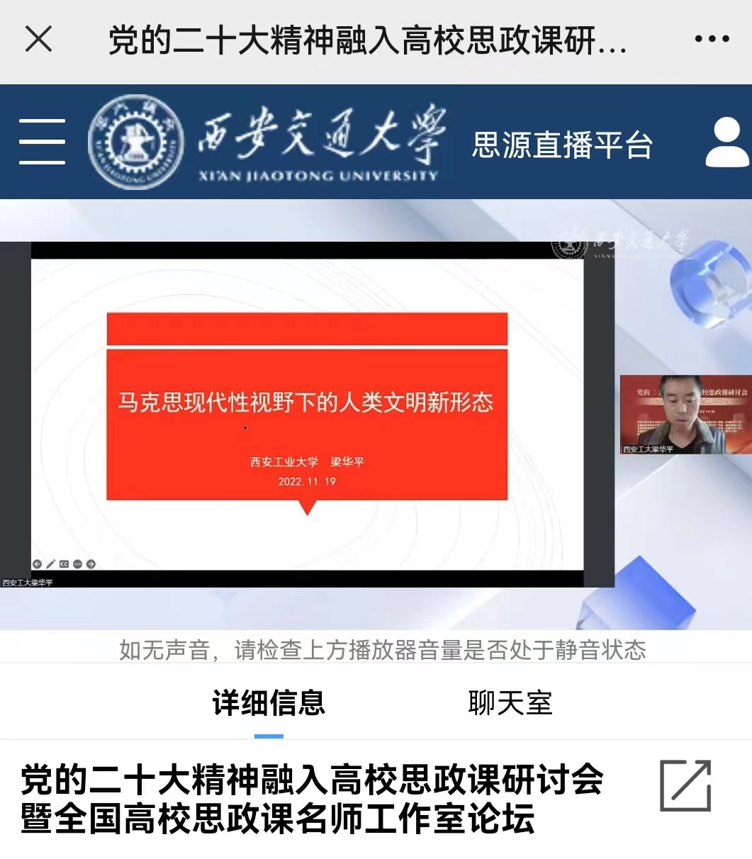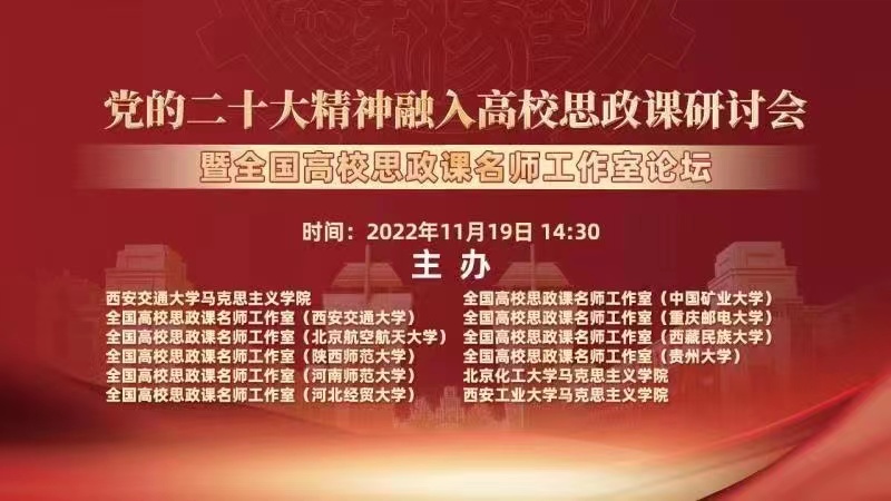 2022年11月19日,由公司与西安交通大学MK体育、全国高校思政课名师工作室(西安交通大学等)共同主办的党的二十大精神融入高校思政课研讨会暨全国高校思政课名师工作室论坛成功举办。来自西安交通大学、北京航空航天大学、北京化工大学、陕西师范大学、河南师范大学、MK体育官网、河北经贸大学、中国矿业大学、重庆邮电大学、西藏民族大学、贵州大学等11所高校的12位专家学者做了精彩发言。本次研讨会通过腾讯会议和交大思源直播平台直播,来自全国各地超过8000余名师生在线参加会议或收看直播。