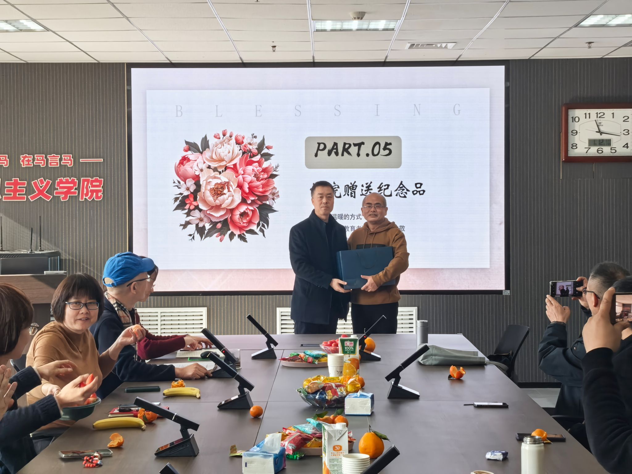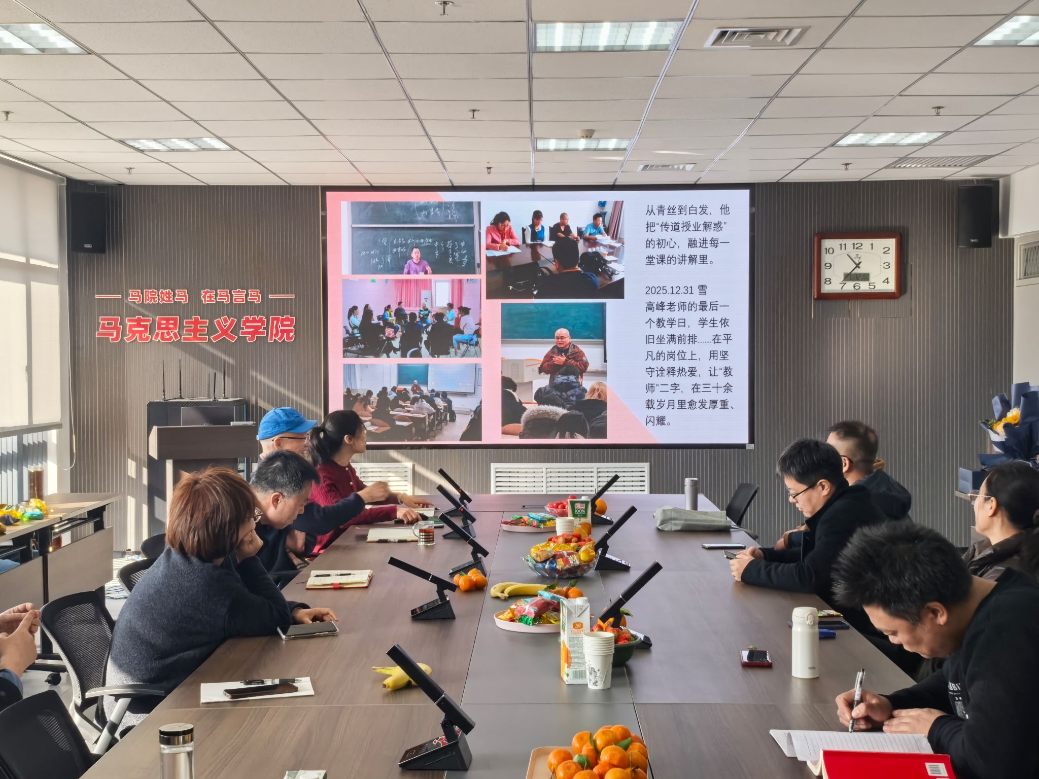 座谈交流环节暖意融融,教师代表纷纷发言,追忆与高老师共事的难忘时光。他是同事眼中的良师益友,谦逊低调、友善真诚,以其特有的教学方法,使思政课兼具思想深度与课堂温度;是员工眼中最喜爱的老师,关怀备至、循循善诱,悉心疏导员工困惑,关心员工成长,阐释师者的仁厚与担当。
