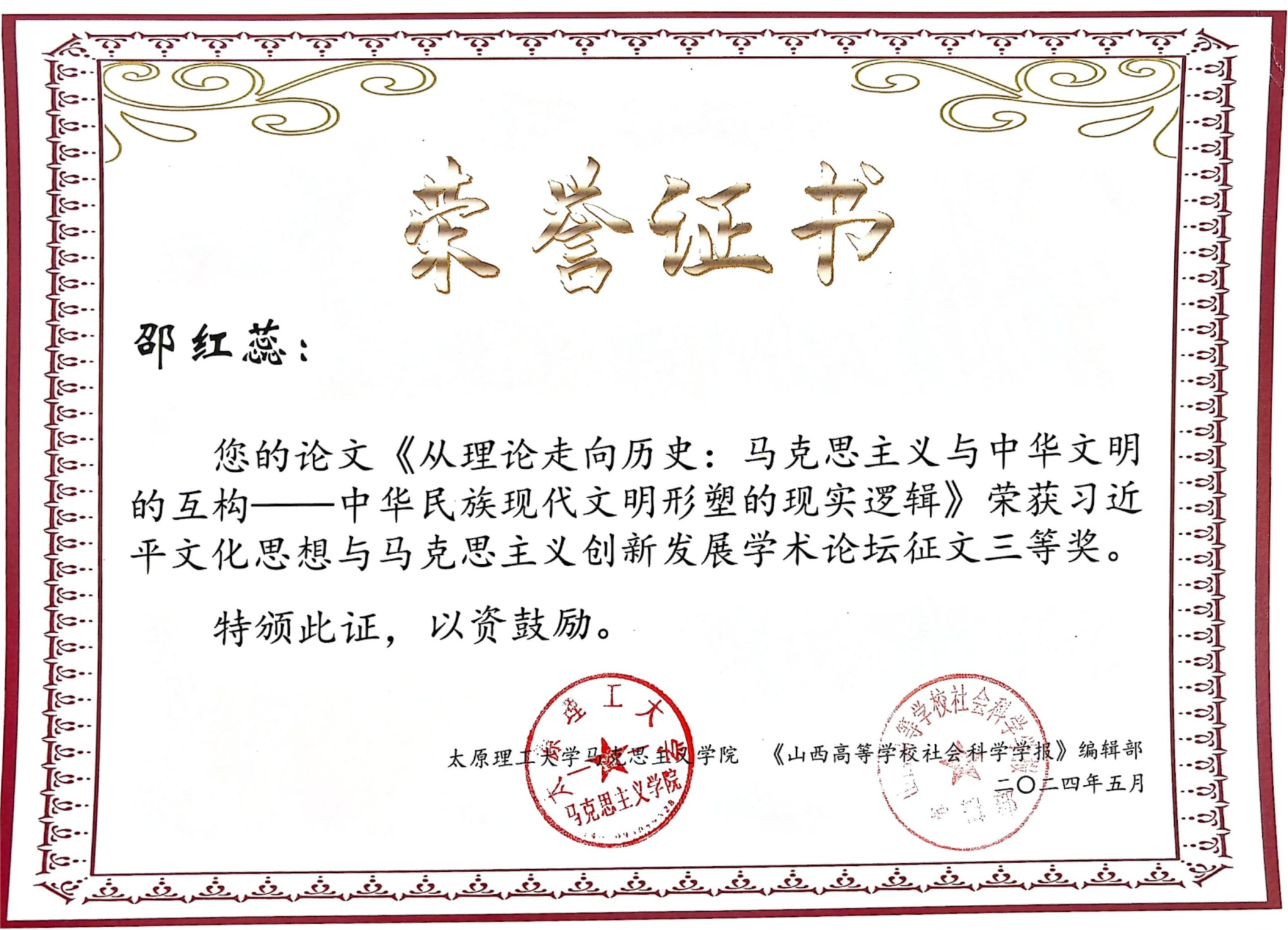 5月11日,MK体育、党建研究中心邵红蕊博士参加了由太原理工大学、《山西高等公司社会科学学报》编辑部共同主办的习近平文化思想与马克思主义创新发展学术论坛。来自中央党校(国家行政公司)、清华大学、中国人民大学、北京师范大学、山东大学、厦门大学、中国海洋大学、MK体育官网等全国高校、党校和科研机构的一百余位专家学者参加了此次学术论坛。