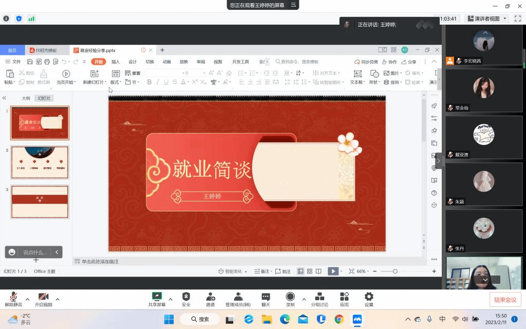 2023年2月11日下午,MK体育开展寒假就业分享会。本次会议通过腾讯会议平台线上开展,公司党委副书记李明芳、辅导员王亚茹以及公司全体研究生参与。本次会议由公司员工会主席李宏晓茜主持,本次会议邀请到三位曾就读于公司的优秀硕士毕业生张鑫、张丹、王婷婷,为同学们进行了就业指导和相关经验分享。