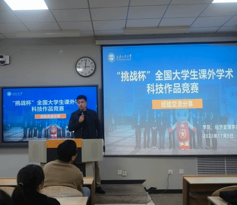 接下来,由公司“挑战杯”国赛一等奖获得者、经济管理公司研究生杨爽和张志毅为同学们分享了他们的参赛经验。杨爽展示了“挑战杯”的赛事流程,她从如何选题、团队如何建等方面进行了细致地讲解,并选取了她们参赛时具有代表性的第十八届“挑战杯”获奖项目作为案例展示,分析该项目的闪光点与创新点,强调总结了参赛项目需注重“选题的时代性、方向的前瞻性、学科的前沿性、探索的创新性、方法的科学性”的参赛要点。张志毅同学从答辩PPT制作技巧和参赛文本打磨两个方面为同学们进行培训指导,他指出具体文本要能够按照评审细则提取项目重点内容,能够立足评审角度呈现内容并有图、表、文结合的多感官刺激相结合。